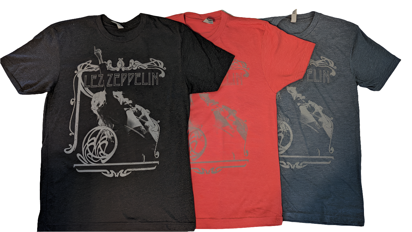 Our take on Led Zeppelin’s elegant 1969 band promo tee. In the style of the Art Nouveau movement (1890-1918), a sinuous and flowing motif frames one of the hallmarks of a Lez Zeppelin performance: The Bow Solo! One of our most popular shirts, this soft, poly-blend tee comes in three classic colors: Charcoal, Vintage Red and Indigo Blue.