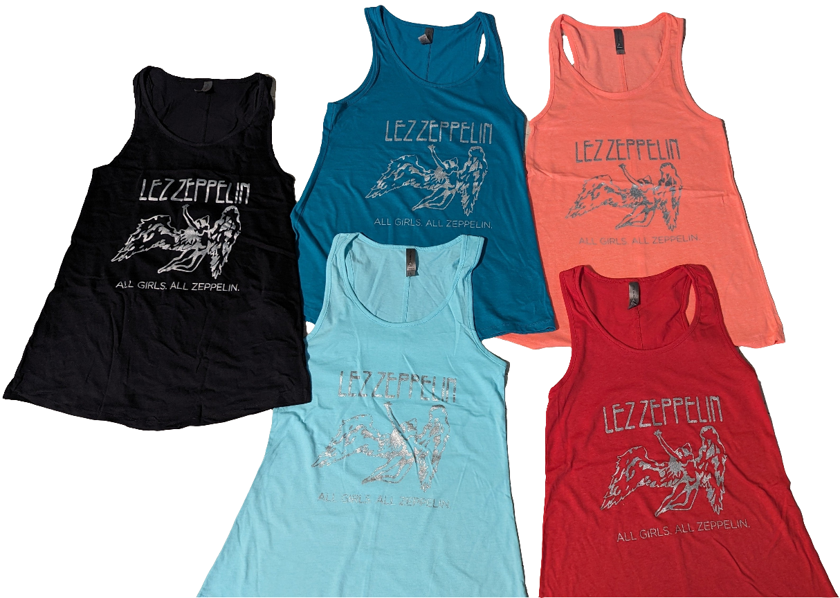 Here’s the classic cotton tee fit for summer – or when in the throes of a hot and sweaty crowd at a Lez Zeppelin show. Super comfy, super cool. Now in 5 colors!! (Note: these run a bit big.) **Please view 2nd picture for color accuracy**